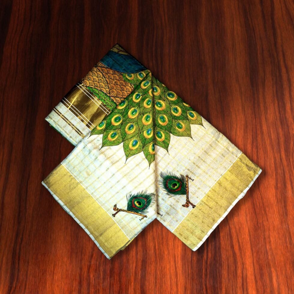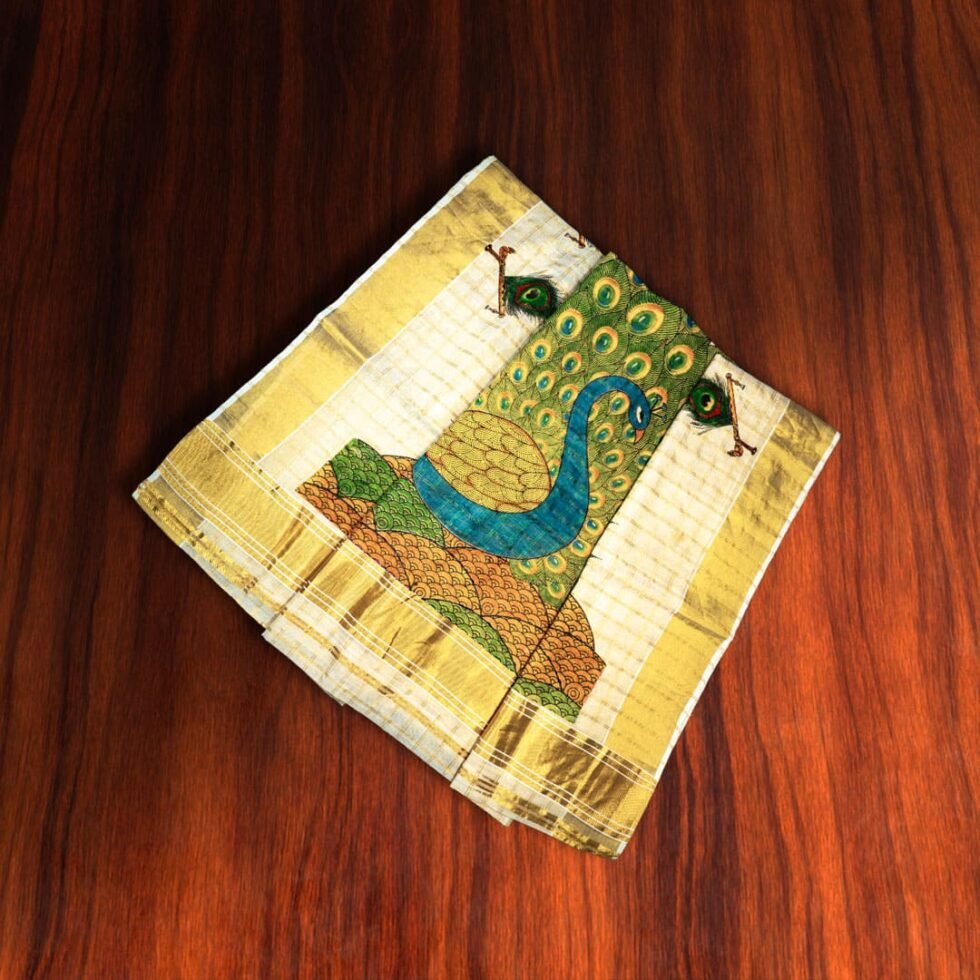 Woven by skilled artisans, this saree not only reflects Kerala’s timeless handloom heritage, but also celebrates India’s spiritual and aesthetic symbolism through the peacock — the national bird.