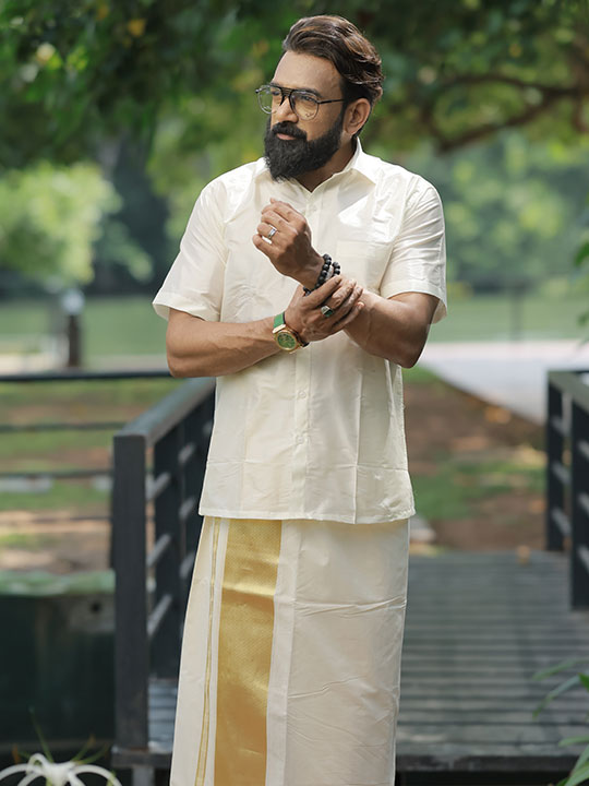 When it comes to Kerala men’s traditional wear, nothing matches the charm of a crisply folded Kasavu Mundu and a perfectly stitched cotton shirt with golden borders.
